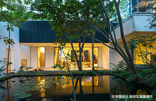建て主は既存庭に対しての思い入れが強く、幼少期の思い出が詰った庭には樹齢70~80年の高木や古池があり、これらのほとんどを残し建物を配置している。庭は建物配置により玄関を意識した招きの前庭と各諸室が囲い込む憩いの主庭に分け、古池は溜め水だった状態を循環できるよう水庭を造り、前庭と主庭を繋ぐ中間的領域に設けた。建て主の要望は、「庭と池を必ず残すこと」と「家族同様のペットとともに暮らせる空間、庭づくり」、そして「医学専門書を含めた3000冊程度の書庫」を強く要望された。庭はペットの運動を兼ねた散歩ができるよう造園業者の方に協力していただき、内部の空間に関しては2階の書庫を除いて全てのエリアをペットと共に暮らし、季節による木々の変化・木洩れ日・どこからとなく聞こえてくる野鳥の鳴き声、そして水庭のせせらぎの音は、内外を通じて四季折々に異なった表情を奏で、その変化が住居全体にスローライフな感覚をもたらしてくれる住まいとなった。セラトレーディング商品は使用場所を含めデザイン性を重視して当事務所から建て主に提案した。