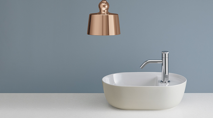 シンプルなテーブルに置かれた、水で満たされたボウルからインスピレーションを受けたという手洗器は、穏やかな楕円フォルムと繊細で、薄くシャープなエッジが印象的です。