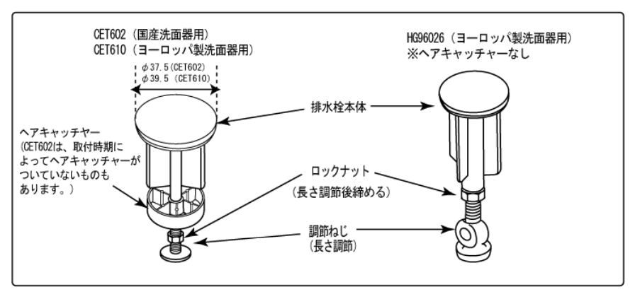 ヨーロッパ製洗面器用の排水ヘッド部は、主に大きな異物を堰き止める仕切り状の構造となっており、髪の毛や細かなゴミをキャッチする機能とは異なりますので、あらかじめご留意ください。