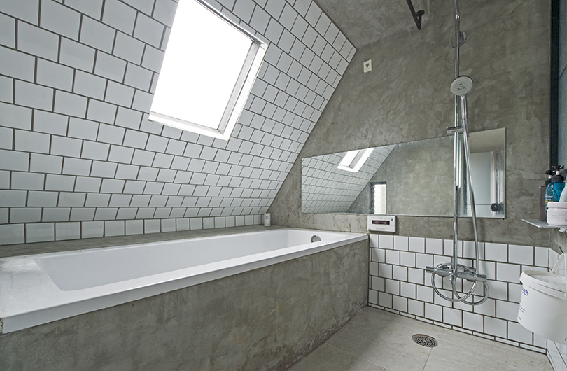 ダークな石目のタイルを基調とした壁面に木目調の床タイルを組み合わせた、配色の対比がスタイリッシュなバスルームです。 水栓は壁に合わせたブラック、バスタブは石目を引き立たせるホワイトをセレクト。洗練された空間で、一日の疲れを忘れさせてくれる極上のバスタイムが過ごせそうです。