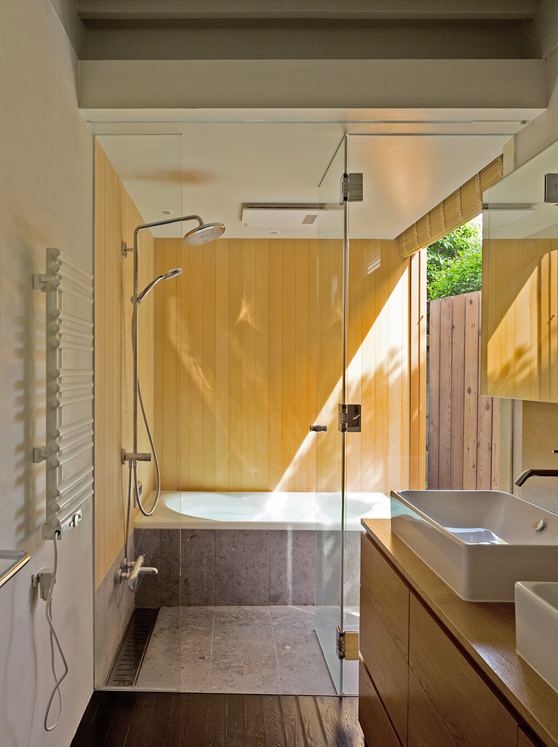 木製の一本引戸を開けると露天風呂のようになる浴室。米ヒバ羽目板が自然光を美しく映し出すキャンバスになっています。シャワーには居心地を邪魔しないデザインのシャワーパイプを。オーバーヘッドシャワーが日常を忘れさせてくれます。