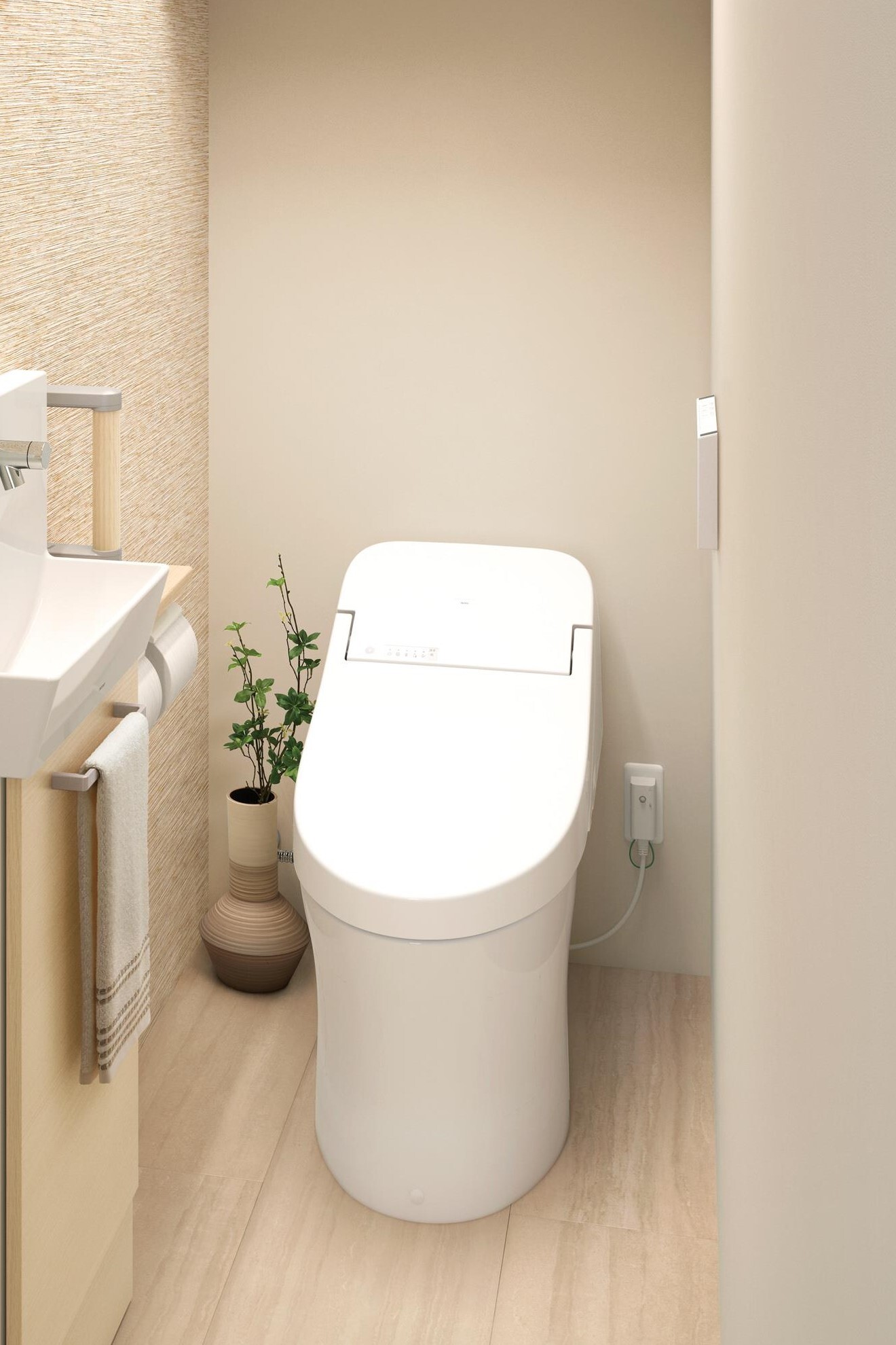壁の収納棚や床面積を有効活用した収納付き便器台など、収納スペースを設ける場所は、便器から60cm以上離しておくと便利で使いやすくなります。このように工夫することで、トイレはより快適で機能的になります。