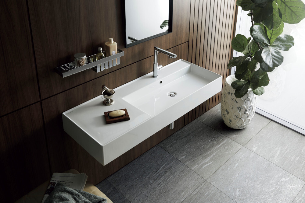 また、壁付タイプは、カウンターが不要なので、コンパクトな空間にもおすすめ。足もとがすっきりしているので、空間を広々と見せることができます。