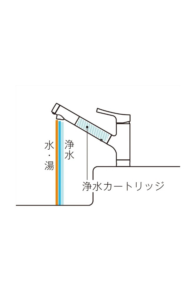 水栓(蛇口)の本体にカートリッジを内蔵したタイプです。キッチンシンクまわりがすっきりし、水道水と浄水の切り替えもワンタッチで簡単。新築やリフォームで標準採用されることが多く、導入の手軽さと見た目の美しさを両立したい方に最適です。