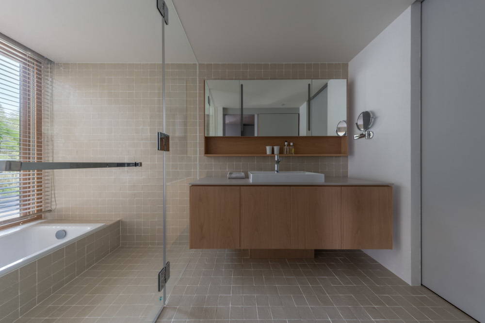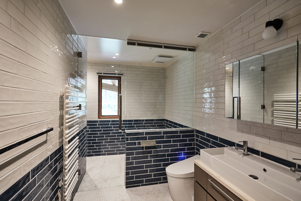 さらに、ガラスの仕切りやドアを使うと、閉塞感を軽減できます。シャワーブースやバスタブの仕切りをガラスにするだけで、視覚的に空間がつながり、圧迫感が軽減します。透明なガラスを使うことで、清潔感もアップします。