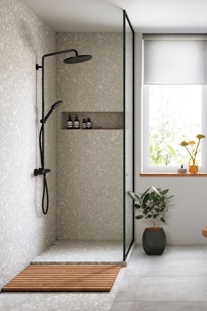 マーブルトーンのタイルは、バスルームに気品と重厚感を与える代表的な仕上げ材です。空間の印象を大きく左右するからこそ、選定にはいくつかの視点が求められます。まず、重要なのがカラーです。白やベージュなどの明るい色味は、清潔感を高めると同時に光をやわらかく拡散し、空間を広く見せる効果があります。一方で、黒やグレーを基調にすると、陰影が際立ち、モダンで落ち着いた雰囲気を演出できます。次に検討したいのが、表面の質感です。光沢仕上げは光を反射し、華やかさやラグジュアリー感を強調します。一方でマット仕上げは落ち着きと上質さを感じさせ、より静謐な印象を空間にもたらします。