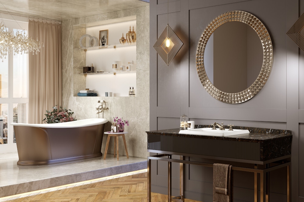 クラシックスタイルのバスルームは、エレガントで華やかな印象が特徴です。アンティーク調の家具や装飾品を使い、重厚感のあるデザインが多いです。色合いは、クリームやベージュ、ゴールドなどの温かみのある色が基本です。