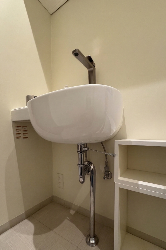 排水を壁の中へ流すタイプです。洗面台の足元に配管が降りてこないため、床を広く使いたい場合に向いています。床掃除がしやすくなるほか、車椅子を使う場合などの足元のスペース確保にも役立ちます。