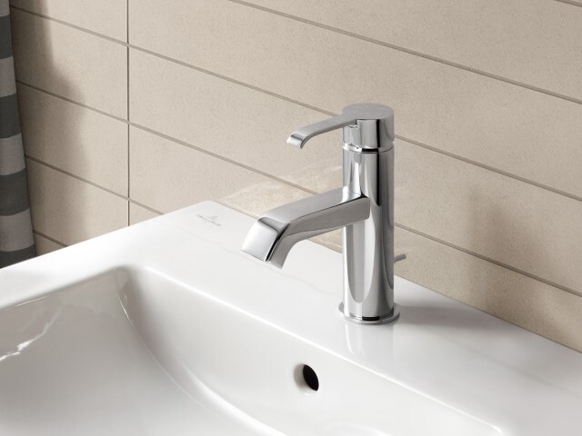 薄く、長い操作ハンドルが特徴的な水栓金具。