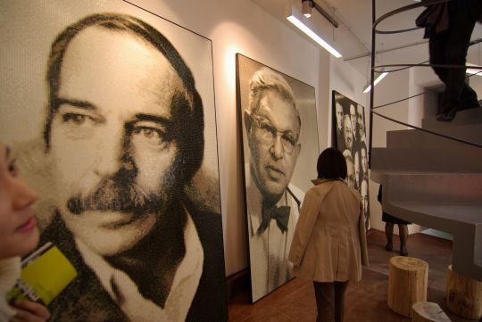 左から2番目はBisazzaのタイルによるヤコブセンの肖像画。 昨年のサローネにも展示してありました。