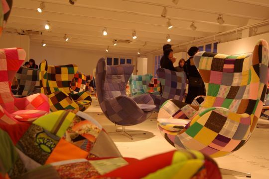 別会場にてeggチェア50周年を記念してタール・アール氏による パッチワークでのReデザイン。(50台も!)