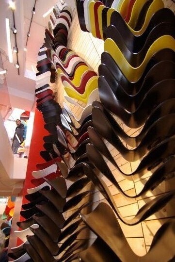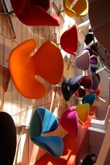 【左】スワンチェアが壁一面に展示されていました。 【右】セブンチェアーも壁一面に展示。