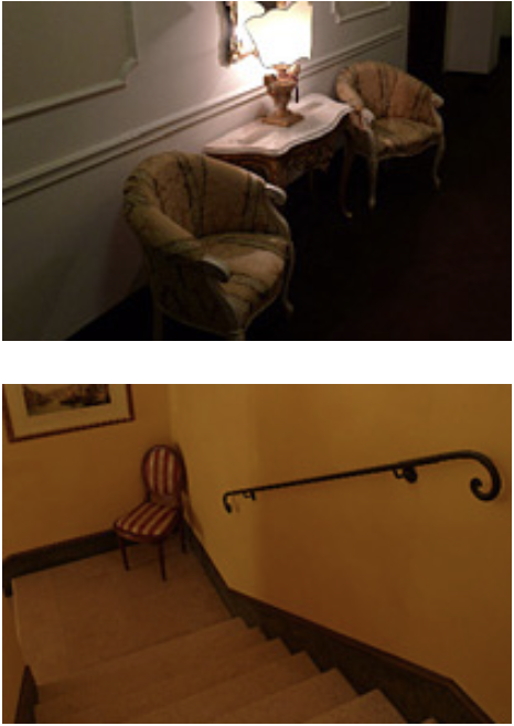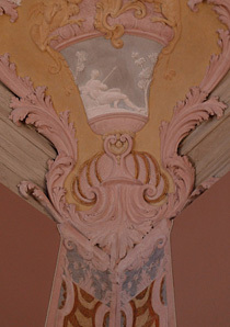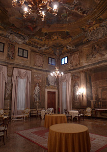 階段を上がるとポルテーゴと呼ばれ正面中央の窓から建物後方まで続く縦長のサロン、ここからカナル・グランデを一望できるバルコニーに出る。神聖ローマ皇帝レオポルト2世(マリーアントワネットの実兄)が1791年にカナル・グランデでレガッタを開催した時このバルコニーから観覧されたという。バンケットルームの「音楽の間」も天井も壁もガスパーレ・ディツィアーニと弟子達のフレスコ画に覆われ、建築が天空まで届くかの騙し絵の下で、アポロ、ビーナス、ジュピターと神々に囲まれながらのディナーも可能だ。カウンターテナーの鋼鉄の天使のような歌声を響かせてみたい。一ヵ所だけカモフラージュの壁画があり、その隠し扉から愛人が舞踏会の最中に他のゲストに気がつかないようにサグレード卿の私室に忍べる通路に繋がっていたという。