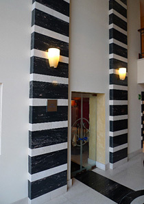 部屋を出てホテル建築探検の散歩に出る。ホテル空間は5年に及ぶ困難だった修復・再建・改装(Francesco Amendolagine教授の監督でStudio CRR / Centro Ricerche Restauroが実施)の成果。建築ディテールのひとつひとつにストゥッキー製粉所の歴史と製粉所にまつわる人々の運命を追想できる。それにしても建築とインテリアのギャップを感じる。静かな中庭とも繋がるカンピエロ・ロビーラウンジでゆっくりしようとソファに身を沈める。と、テーブルやファニチャーのまだ新しい化粧板が剥げていたり角が破損しているのがあちこちで目についた。使い込んで深みのある傷みではない。なんだか薄っぺらな表面だけのインテリア・クオリティーで建築がかわいそうになってきた。