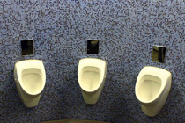 パブリックトイレ。男性用は黒のガラス、女性用は真っ赤なガラスの扉。